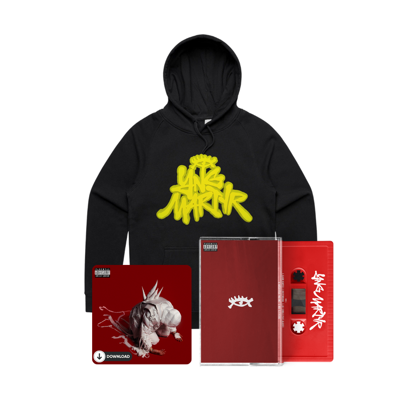 'YNG Martyr' logo printed on a black unisex hoodie. Bundled with your choice of digital download or red cassette.