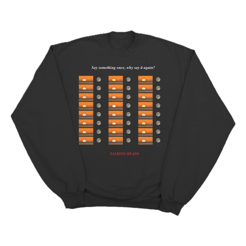Black crewneck style sweatshirt with a sun setting graphic on the front inspired by the official Psycho Killer Music video.
